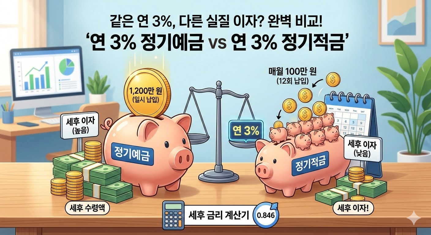 | 구분 | 정기예금 (목돈 예치) | 정기적금 (매월 납입) |